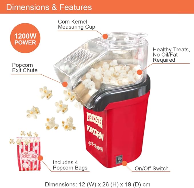 - يبلغ مقاس ماكينة صنع الفشار هذه 26 سم طولاً × 12 سم عرضًا، وتستغرق من 3 إلى 5 دقائق لصنع الفشار للمناسبات مثل حفلات أعياد الميلاد أو المبيت أو مجرد ليلة فيلم في المنزل على الأريكة.