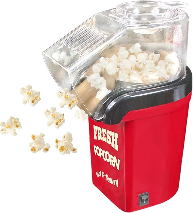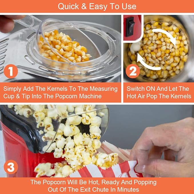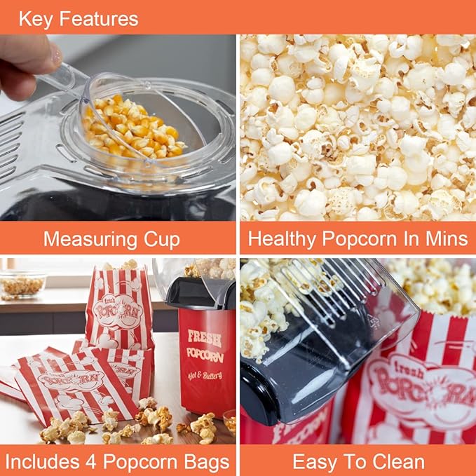 – تستخدم آلة صنع الفشار هذه الهواء الساخن لإخراج حبات الذرة، مما يعني عدم الحاجة إلى استخدام أي زيوت في عملية الطهي مما يجعل الفشار بديلاً صحيًا للوجبات الخفيفة.